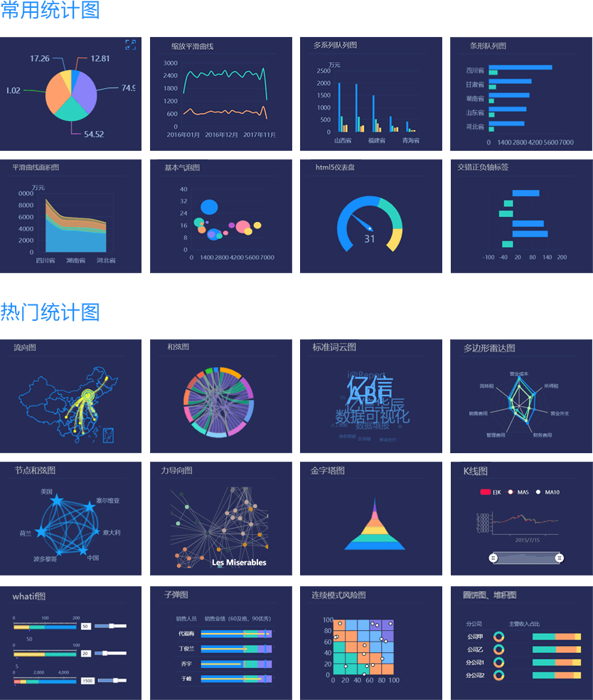 ABI采用JS、FLASH、HTML5三種技術自主開發(fā)統(tǒng)計圖,豐富的統(tǒng)計圖保證了其具有美觀的圖形展現(xiàn)能力,除了常用的柱狀圖、線狀圖、條形圖、面積圖、餅圖、點圖、儀表盤、走勢圖外,還支持和弦圖、圈餅圖、金字塔、漏斗圖、K線圖、關系圖、網絡圖、玫瑰圖、帕累托圖、數(shù)學公式圖、預測曲線圖、正態(tài)分布圖、迷你圖等,樣式包括2D、3D、EXCEL、AUTUMN、FLASH等;通過組合設計可以搭配處上千種視覺效果。