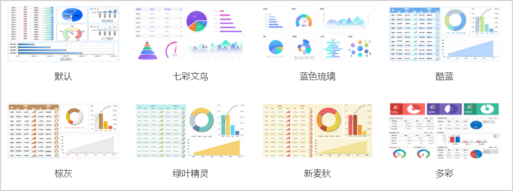 億信ABI內置十余種報表風格,用戶還可自定義報表風格,反復復用。用戶只需選取一個風格樣式進行應用,實現立刻換膚,縮短樣式調整時間。